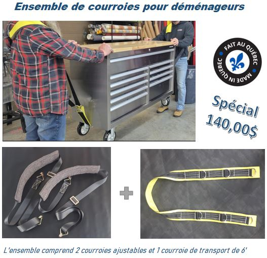 Nous sommes aussi concepteurs et fabricants de courroies pour les déménageurs, le transport et beaucoup d'autres domaines. Nous sommes fiers de pouvoir répondre aux besoins particuliers de nos clients.